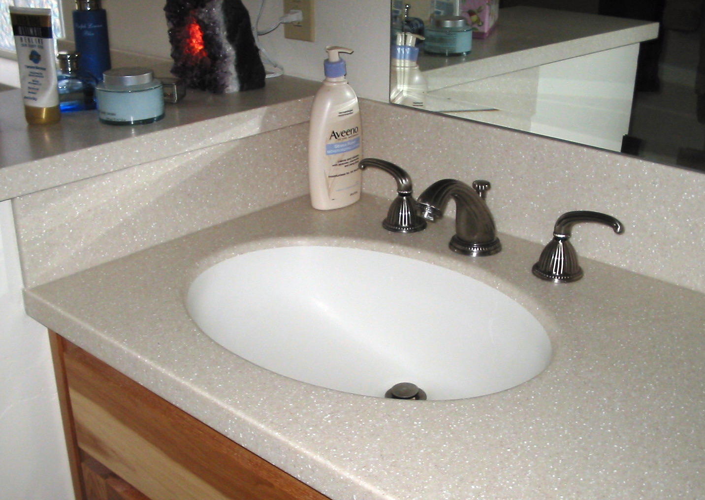 New bathroom vanity using LG HiMacs acrylic solid surface deck and sink.